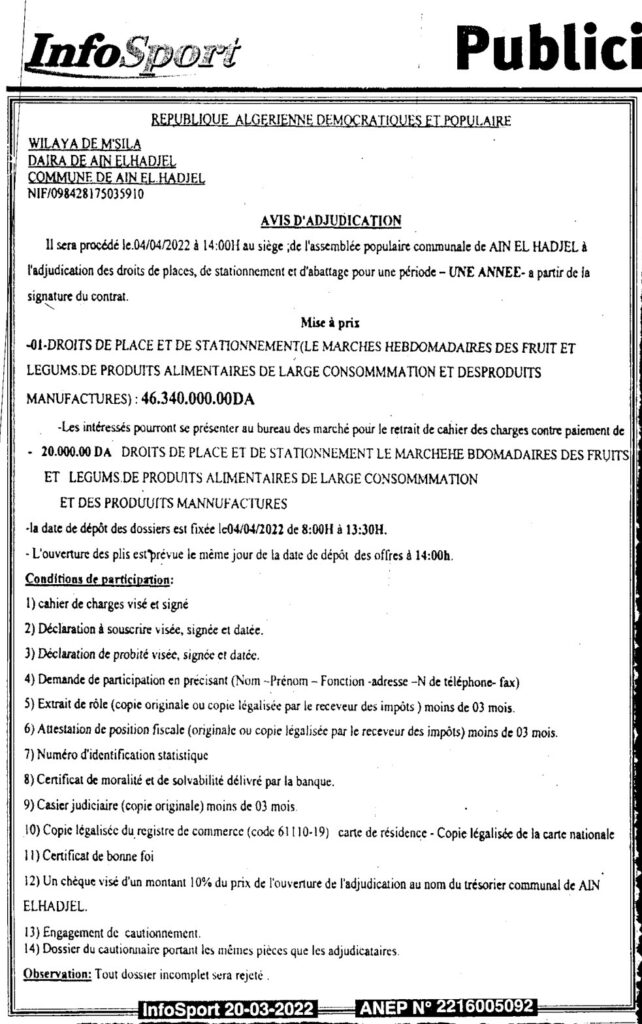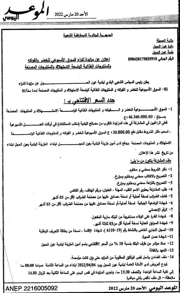 إعـلان عن مزايـدة لكراء السوق الأسبوعي للخضر والفواكه والمنتوجات الغذائية الواسعة الاستهلاك والمنتوجات المصنعة / بلدية عين الحجل