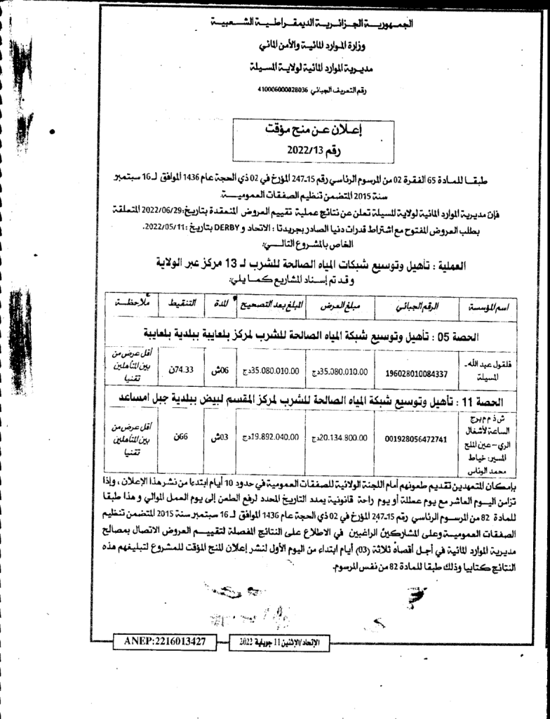 إعـلان عن منـح مـؤقت: تأهيـل وتوسيع شبكات الميـاه الصالحة للشرب لـ 13 مركـز عبـر الولايـة مديرية الموارد المائية لولاية المسيلة
