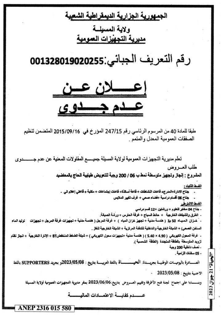 إعلام عن عدم جدوى/ مديرية التجهيزات العمومية لولاية المسيلة