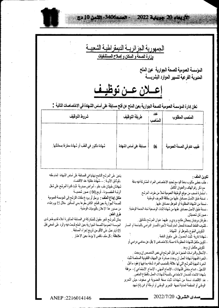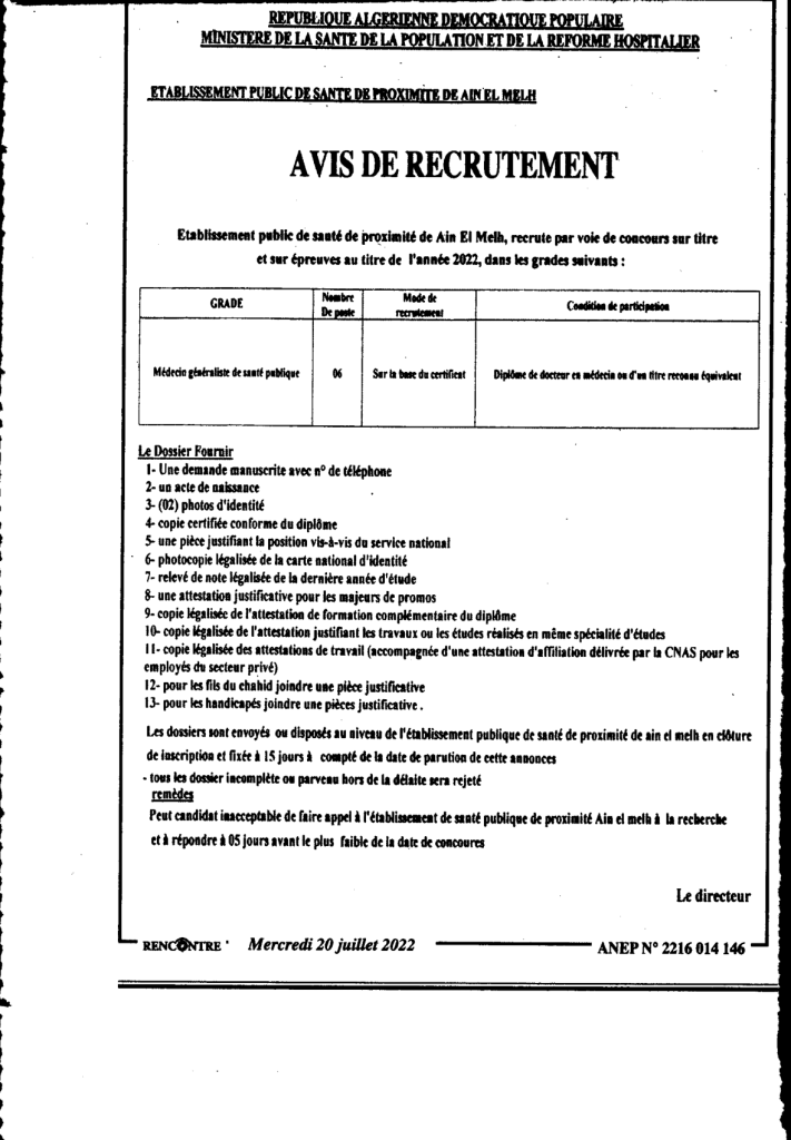 تعلن المؤسسة العمومية الاستشفائية عين الملح عن تنظيم مسابقة على أساس الشهادة في الإختصاص التالي: طبيب عام في الصحة العمومية20 يوليو، 20220 53 شاركها فيسبوك X مشاركة عبر البريد طباعة
