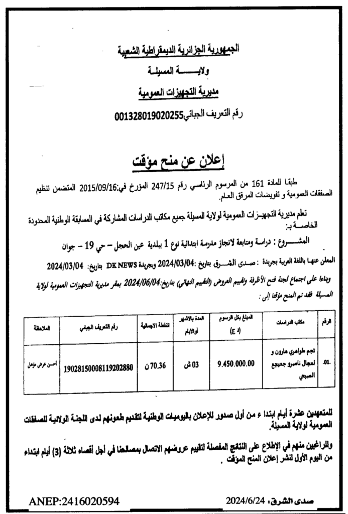 إعلانة عن منح مؤقت دراسة ومتابعة لانجاز مدرسة ابتدائية نوع 1 ببلدية عين الحجل/ مديرية التجهيزات العمومية لولاية المسيلة