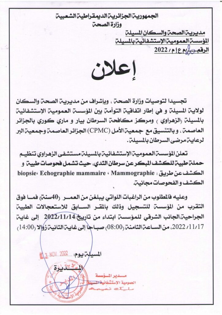 إعلان/ المؤسسة العمومية الإستشفائية بالمسيلة