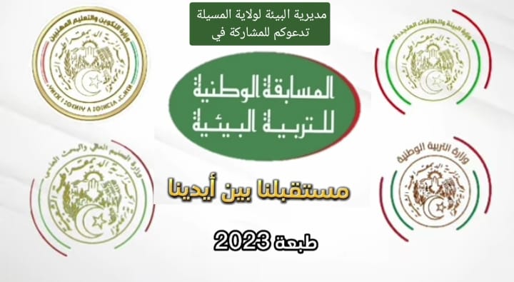 المسيلة/ مستقبلنا بين أيدينا، تحت إشراف السيد رئيس الجمهورية الجزائرية، تنظم مسابقة وطنية للتربية البيئية طبعة 2023 تحت شعار “بــيـــئـــتــنــا مــســتـقــبـلـنـــا” بالاشتراك مع وزارة التعليم العالي والبحث العلمي، وزارة التربية الوطنية، وزارة البيئة والطاقات المتجددة، وزارة التكوين والتعليم المهنيين، ومركز البحث في الإعلام العلمي والتقني: