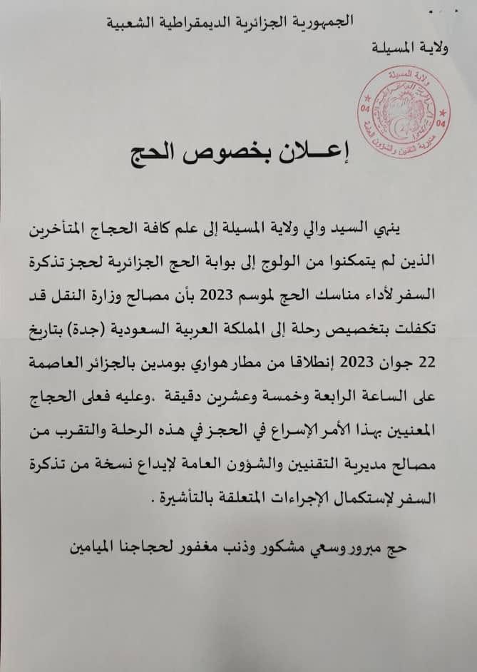 إعلان بخصوص الحجاج المتأخرين الذين لم يتمكنوا من حجز تذكرة السفر