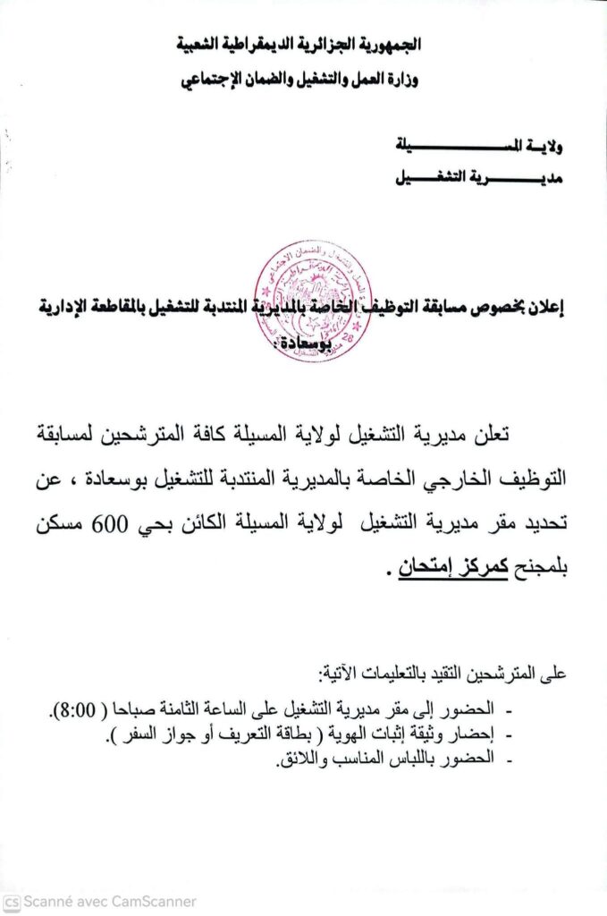 إعلان بخصوص مسابقة التوظيف الخاصة بالمديرية المنتدبة للتشغيل بالمقاطعة الإدارية بوسعادة