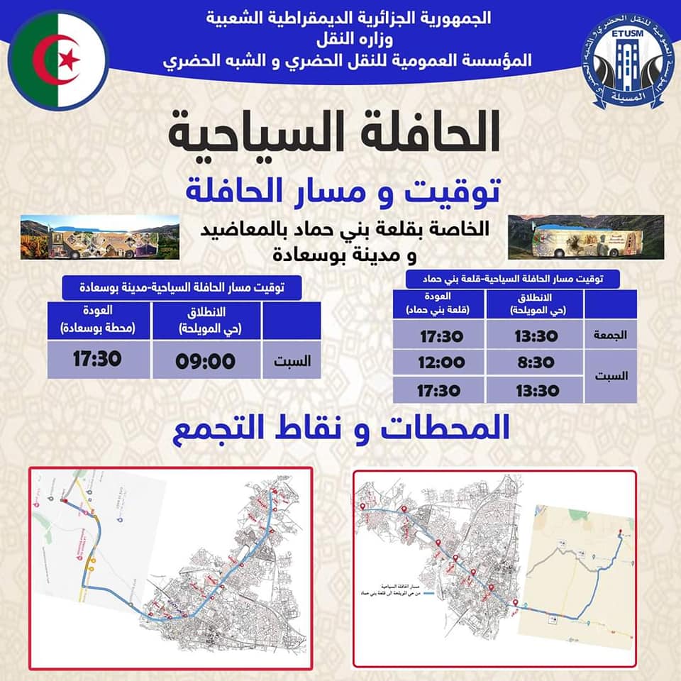 ستشرع الحافلات السياحية لمؤسسة ETUS MSILA ابتداءا من يوم الجمعة والسبت المقبلين بالعمل على الخطين السياحيين بإذن الله وفق البرنامج المرفق وفي حال تسجيل طلب أكثر سيدعم الخطين مستقبلا فمرحبا بالجميع وحرصا على توفير خدمة نوعية على متن الرحلات السياحية تم تزويد الحافلات السياحية بشاشات لعرض وشرح المواقع السياحية والثقافية للولاية مع توفير نظام تحديد موقع هذه الحافلات لتسهيل استعمالها للمواطن (رحلات سعيدة وأوقات ممتعة)