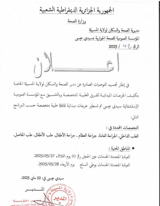 تنفيذا لمخرجات الاجتماع المنعقد يوم 2025/05/18 بين المؤسسة العمومية الاستشفائية سيدي عيسى والمؤسسة العمومية للصحة الجوارية سيدي عيسى تم تسطير برنامج قافلة طبية متخصصة حسب البرنامج التالي: