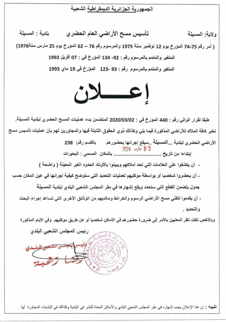 إعلان/ تأسيس مسح الأراضي العام الحضري بلدية المسيلة