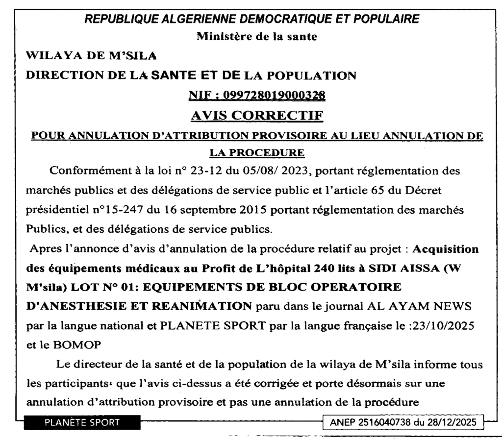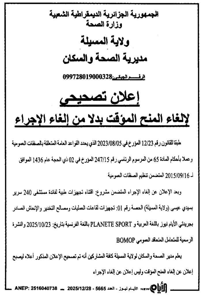 إعلان تصحيحي لإلغاء المنح المؤقت بدلا من الإلغاء الإجراء/ مديرية الصحة والسكان لولاية المسيلة