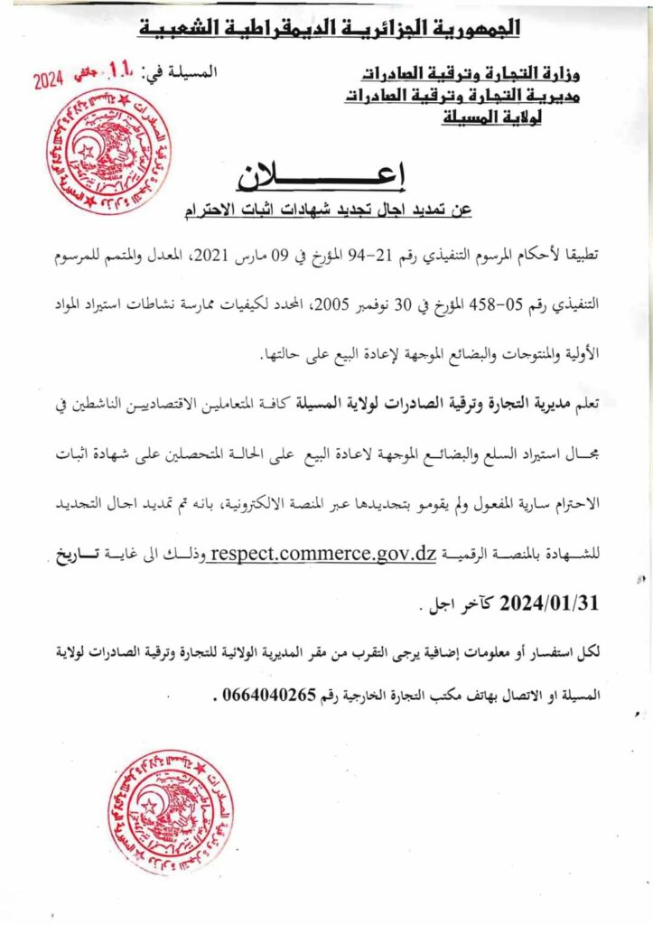 إعلان/ تمديد آجال تحديد شهادات اثبات الاحترام