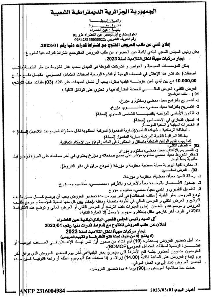 طلب العروض المفتوح مع اشتراط قدرات دنيا لمشروع: إيجاد مركبات مهيأة لنقل التلاميذ لسنة 20231 مارس، 20230 53 شاركها فيسبوك X مشاركة عبر البريد طباعة