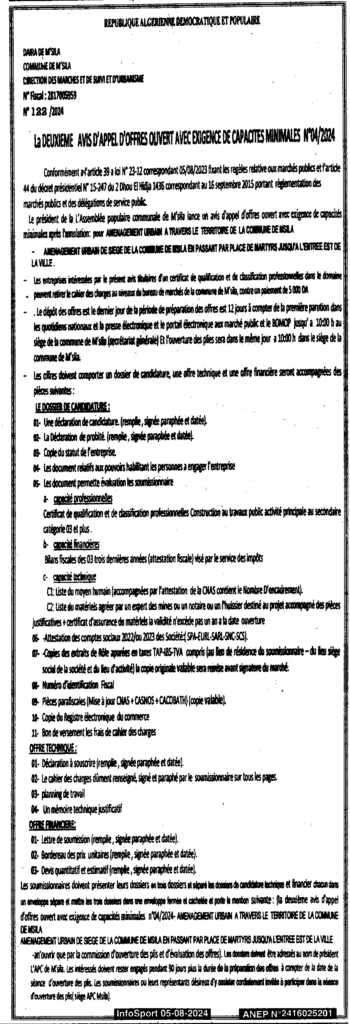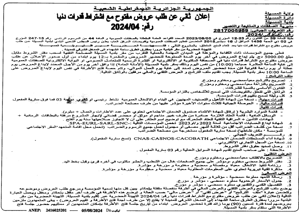 إعلان ثاني عن طلب عروض مفتوح 2024/04 بلدية المسيلة
