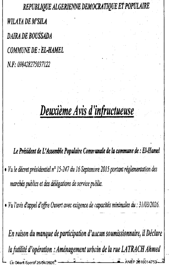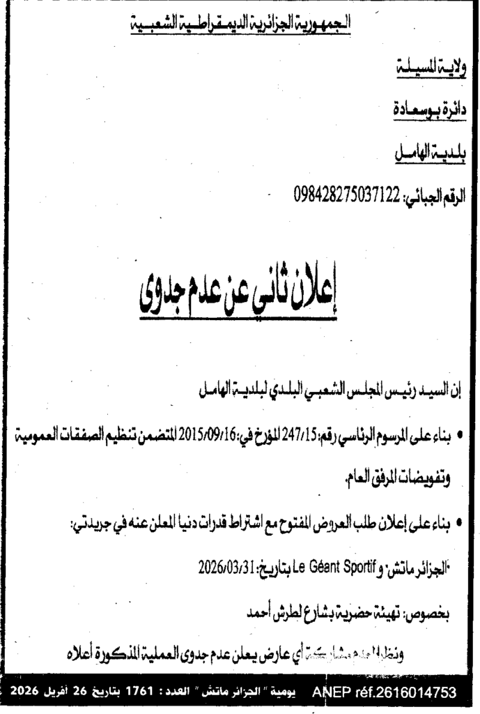 إعلان ثاني عن عدم جدوى/ بلدية الهامل