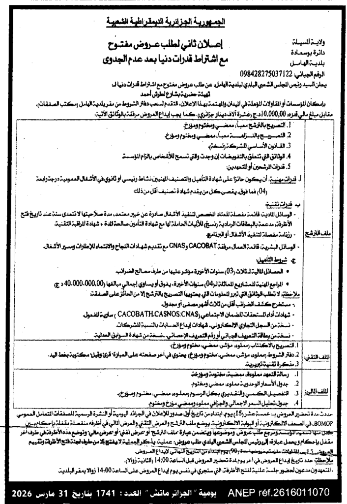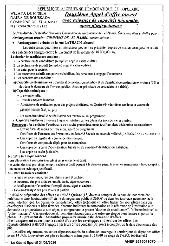 إعلان ثاني عن لطلب عروض مفتوح بعد عدم الجدوى تهيئة حضرية بشارع لطرش أحمد/ بلدية الهامل