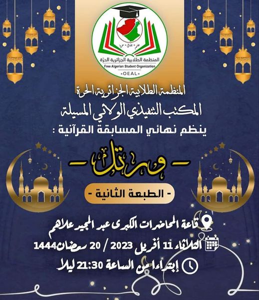 جامعة المسيلة/ المنظمة الطلابية الجزائرية الحرة المكتب التنفيذي الولائي المسيلة ينظم الحفل الختامي لمسابقة “ورتل” لتجويد القرآن الكريم في طبعتها الثانية وذلك يوم الثلاثاء 11 أفريل 2023 الموافق لـ 20 رمضان بقاعة عبد المجيد علاهم إنطلاقا من الساعة 21:30 ليلا …
