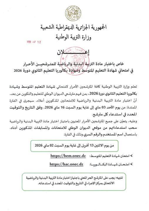 إعلان خاص باختبار مادة التربية البدنية والرياضية للمتـرشحين الأحـرار في امتحاني شهادة التعليم المتوسط وشهادة بكالوريا التعليم الثانوي دورة 2026