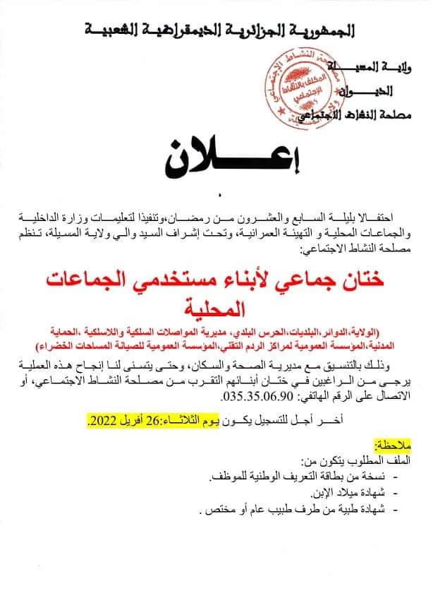 إعلان/ ختان جماعي لأبناء مستخدمي الجماعات المحلية