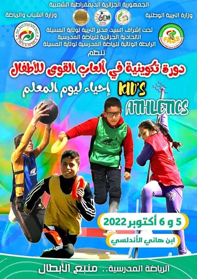 بمناسبة الإحتفال باليوم العالمي للمعلم المصادف لـ 05 أكتوبر من كل سنة تنظم الرابطة الولائية للرياضة المدرسية لولاية المسيلة دورة تكوينية في ألعاب القوى للأطفال … يومي 05 و06 أكتوبر 2022 بمتوسطة إبن هاني الأندلسي المسيلة.