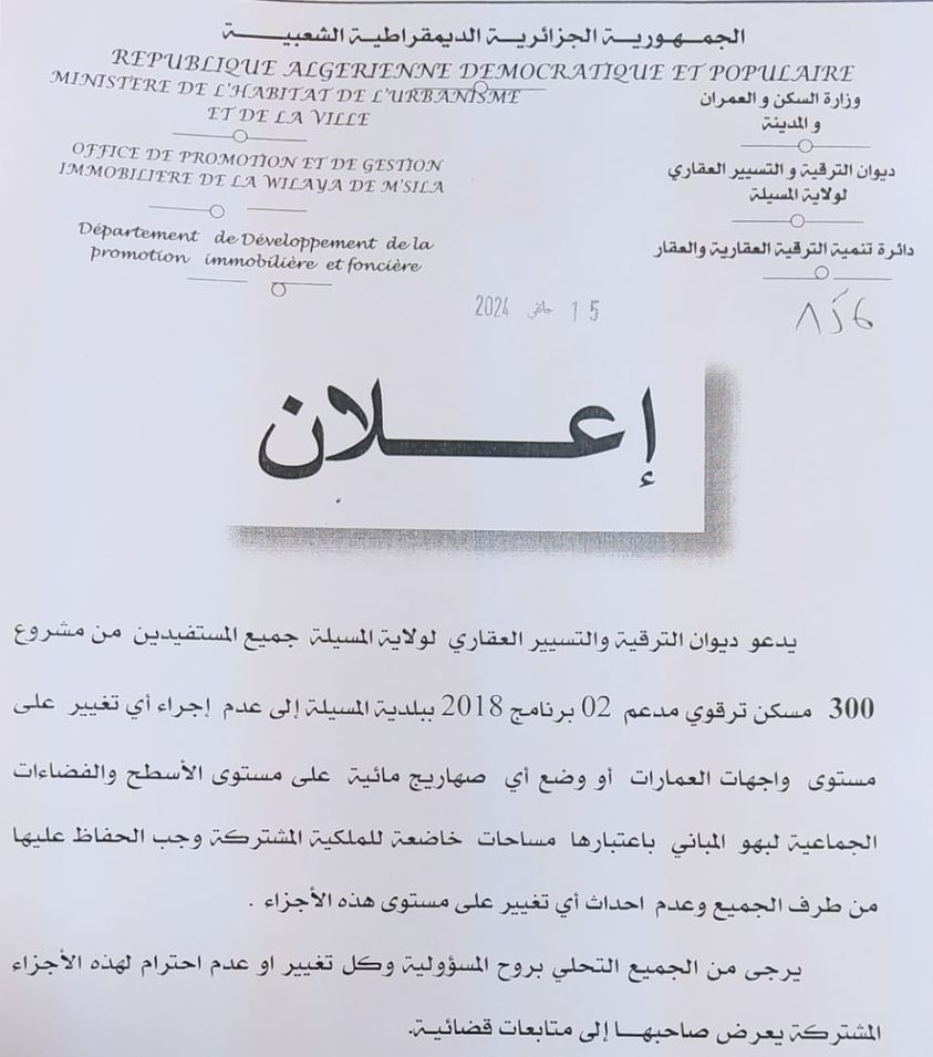 إعلان/ ديوان الترقية والتسيير العقاري لولاية المسيلة