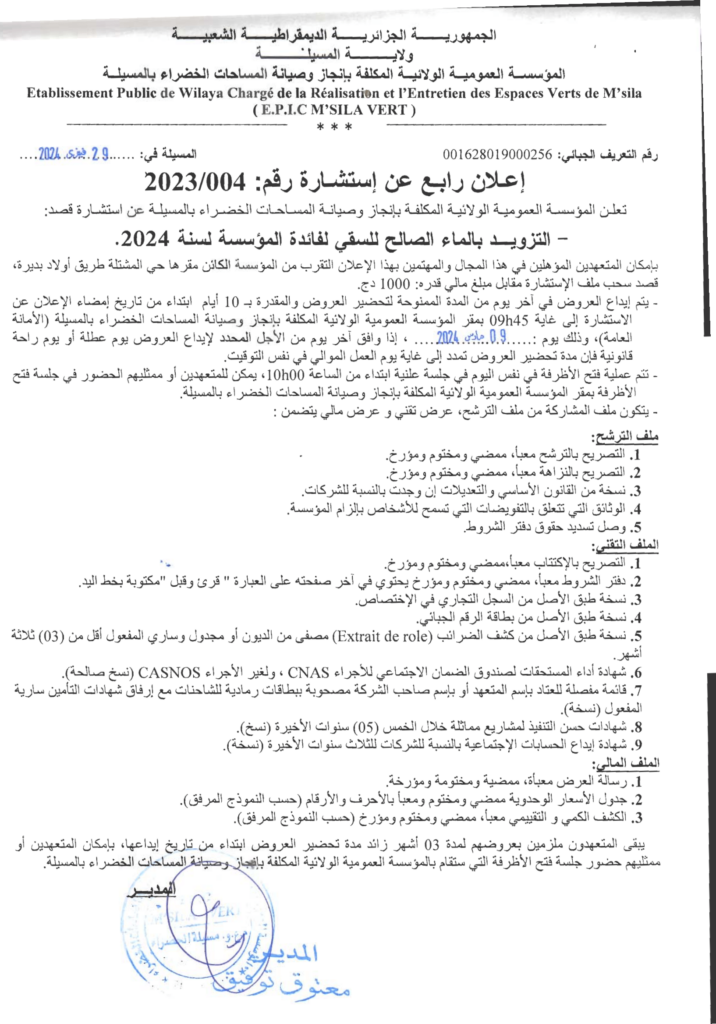 استشارة لأجل: التزويد بالماء الصالح للسقي لفائدة المؤسسة لسنة 20244 مارس، 20240 10 شاركها فيسبوك X مشاركة عبر البريد طباعة