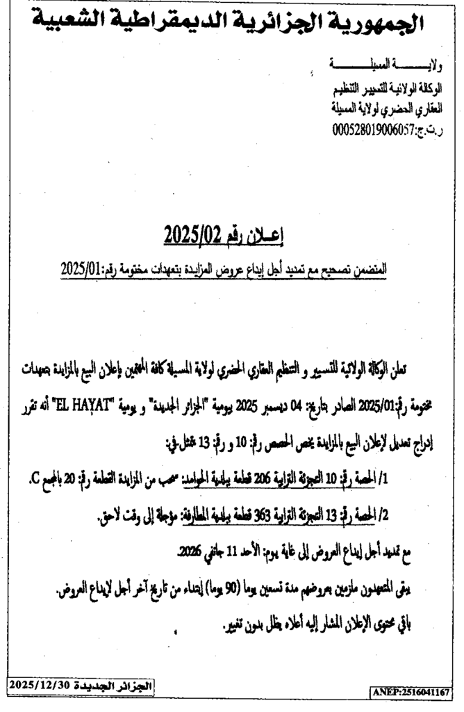 إعلان رقم 2025/02 عن تصحيح مع تمديد أجل إيداع عروض المزايدة بتعهدات مختومة 2025/01