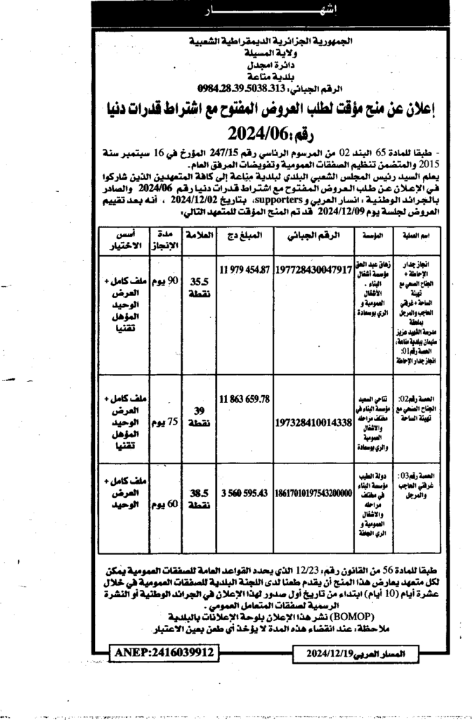 إعلان عنم منح مؤقت لطلب العروض المفتوح 2024/06 بلدية مناعة