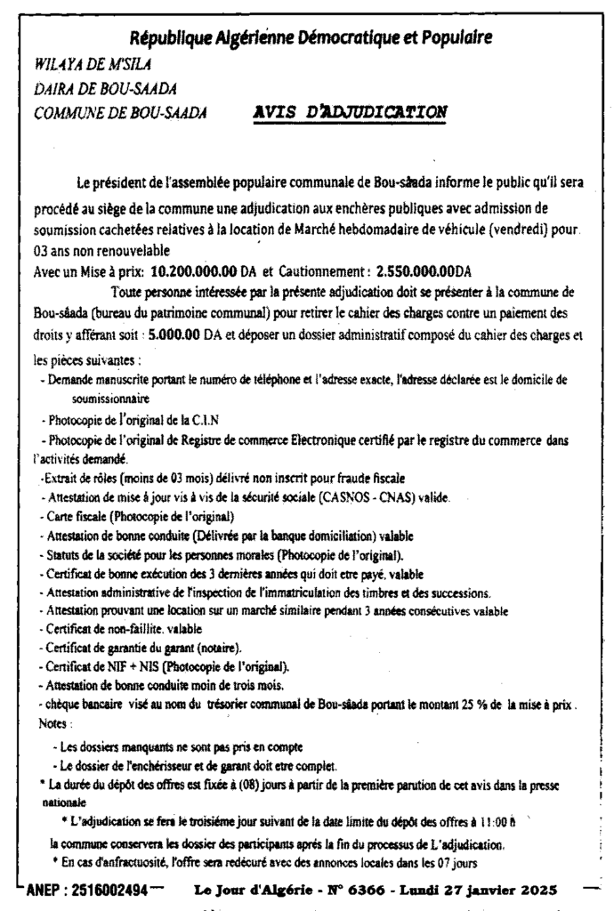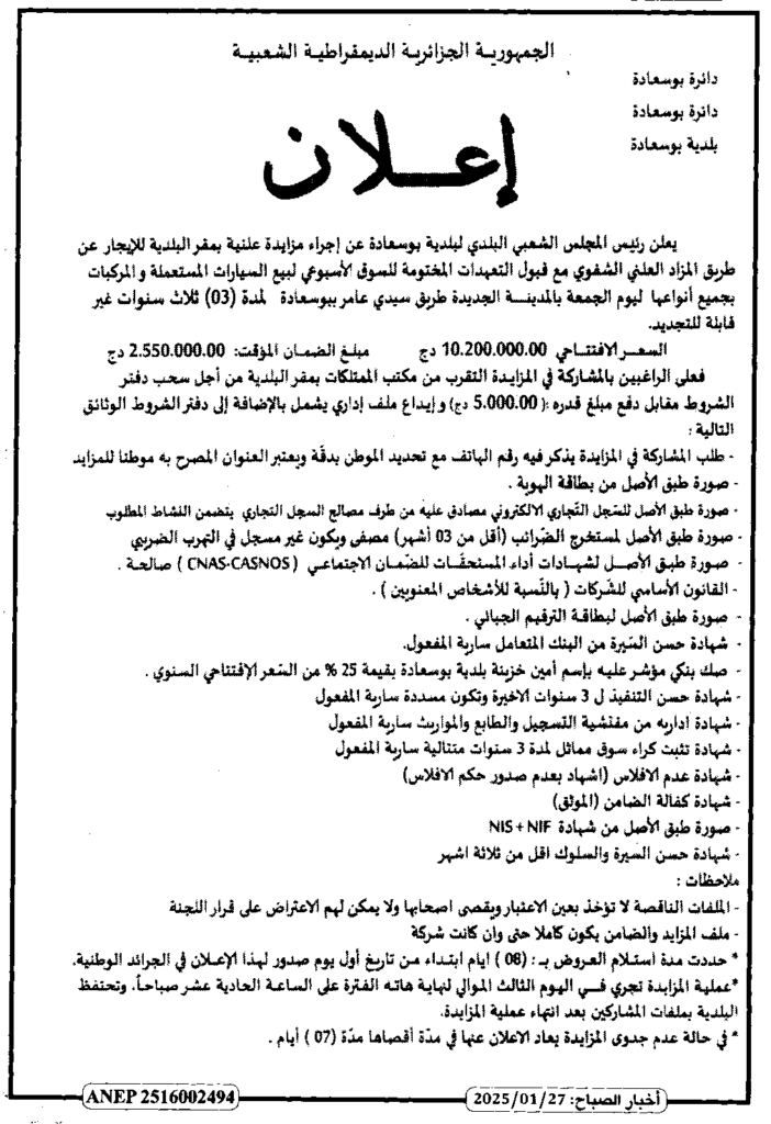 إعلان عن إجراء مزايدة علنية بمقر البلدية للإيجار عن طريق المزاد العلني الشفوي مع قبول التعهدات المختومة للسوق الأسبوعي لبيع السيارات المستعملة والمركبات بجميع أنواعها/ بلدية بوسعادة