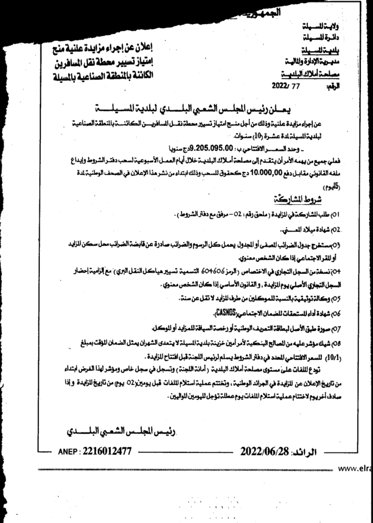 إعلان عن إجراء مزايدة علنية منح امتياز تسيير محطة نقل المسافرين الكائنة بالمنطقة الصناعية بلدية المسيلة