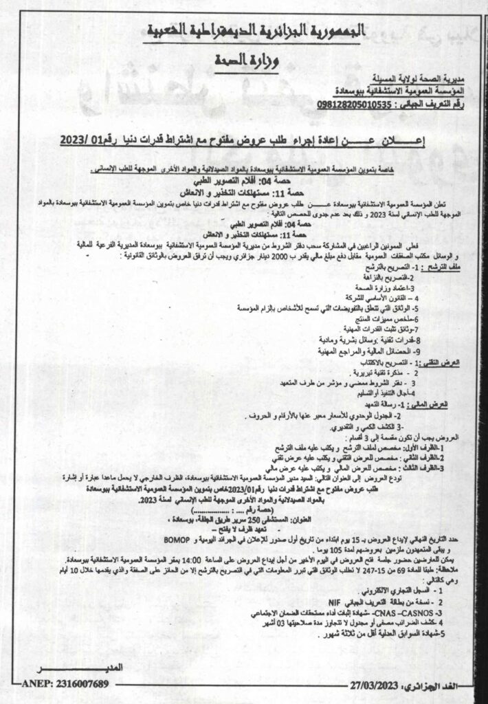 إعلان عن إعادة إجراء طلب عروض مفتوح 2023/01 المؤسسة العمومية الاستشفائية ببوسعادة