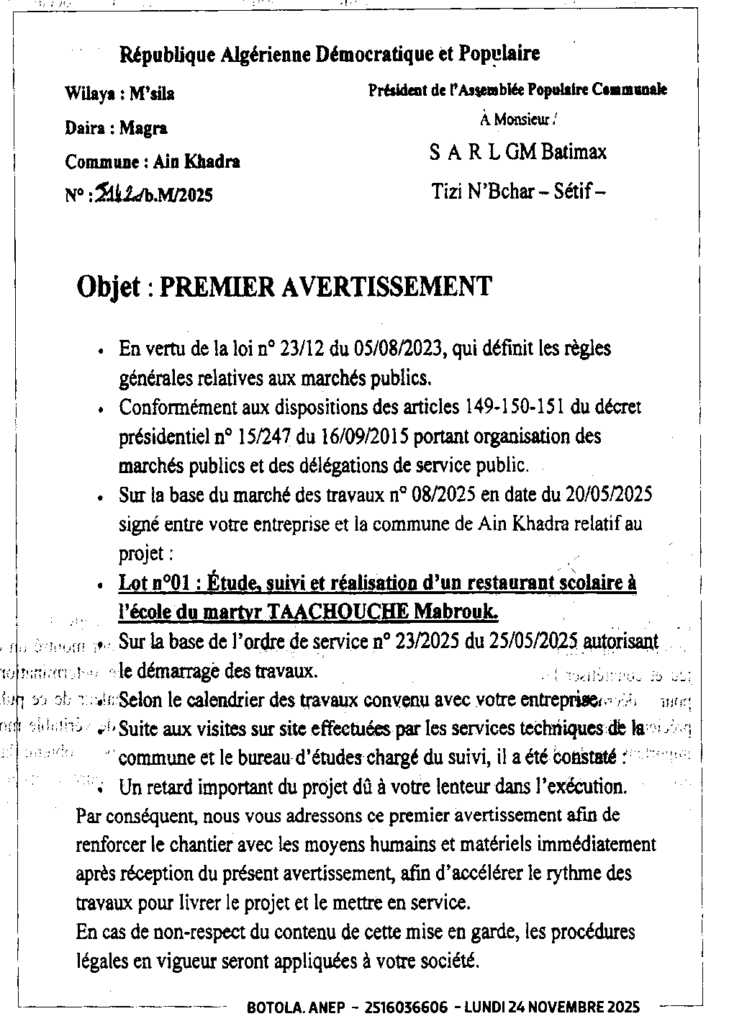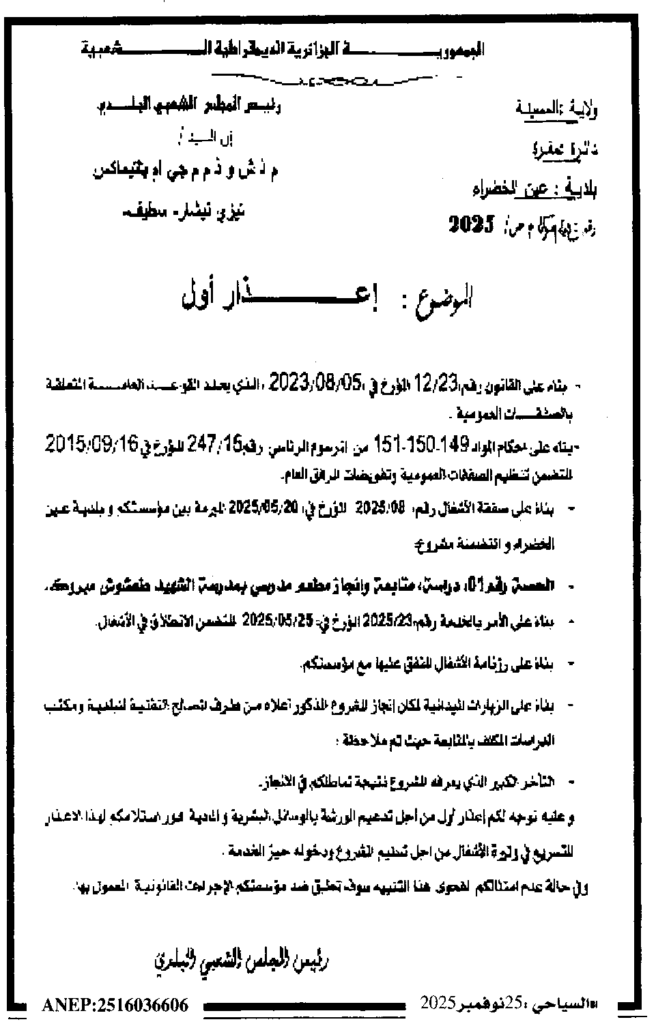 إعلان عن إعذار أول/ بلدية عين الخضراء
