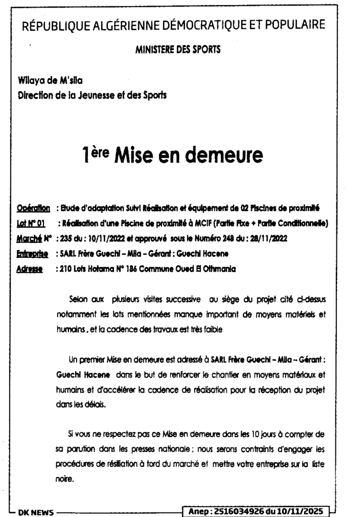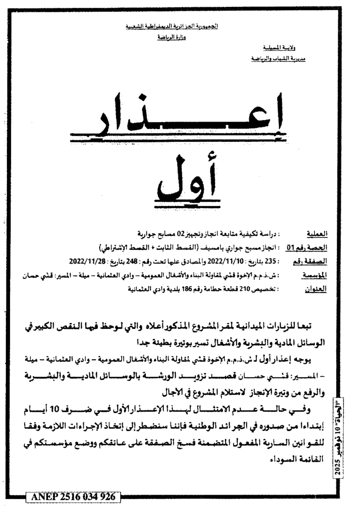 إعلان عن إعذار أول دراسة تكييفية متابعة انجاز وتجهيز 02 مسابح جوارية/ مديرية الشباب والرياضة لولاية المسيلة