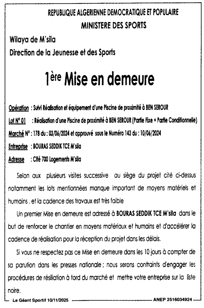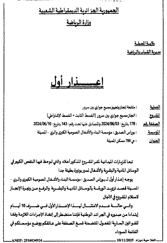 إعلان عن إعذار أول/ مديرية الشباب والرياضة لولاية المسيلة