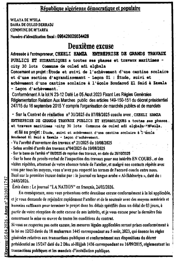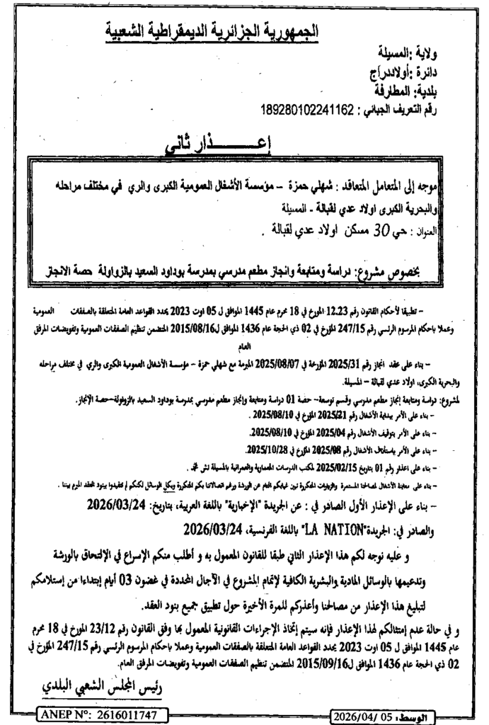 إعلان عن إعذار ثاني دراسة ومتابعة وانجاز مطعم مدرسي/ بلدية المطارفة