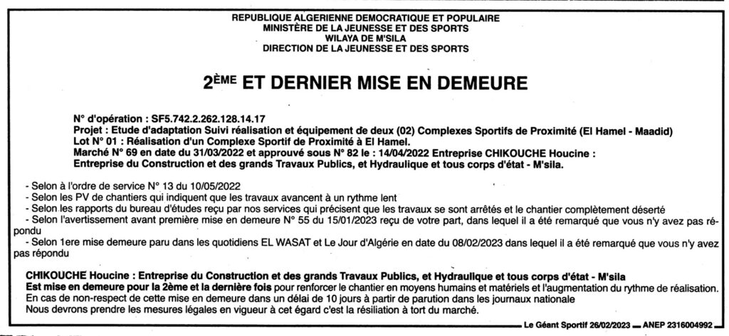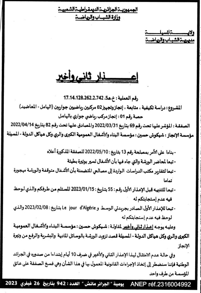 إعلان عن إعذار ثاني وأخير/ مديرية الشباب والرياضة لولاية المسيلة