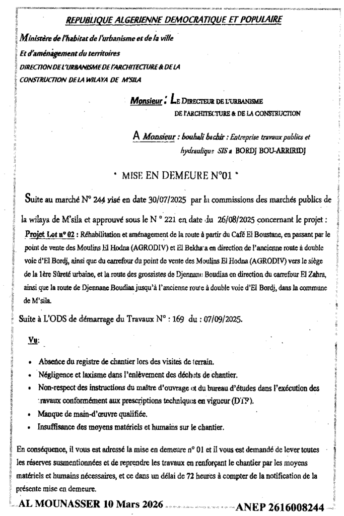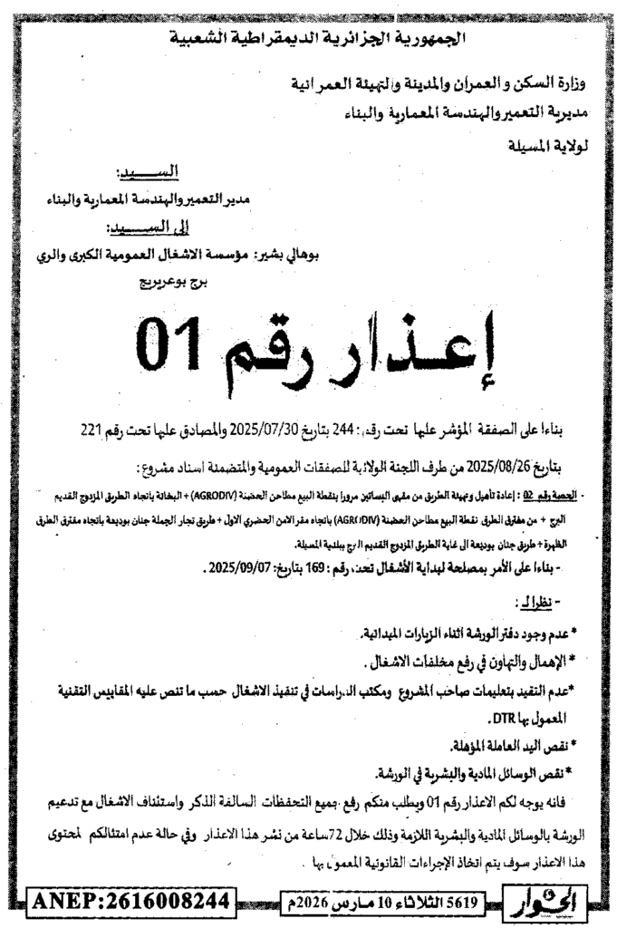إعلان عن إعذار رقم 01 إعادة تاهيل وتهيئة الطريق/ مديرية التعمير والهندسة المعمارية والبناء لولاية المسيلة
