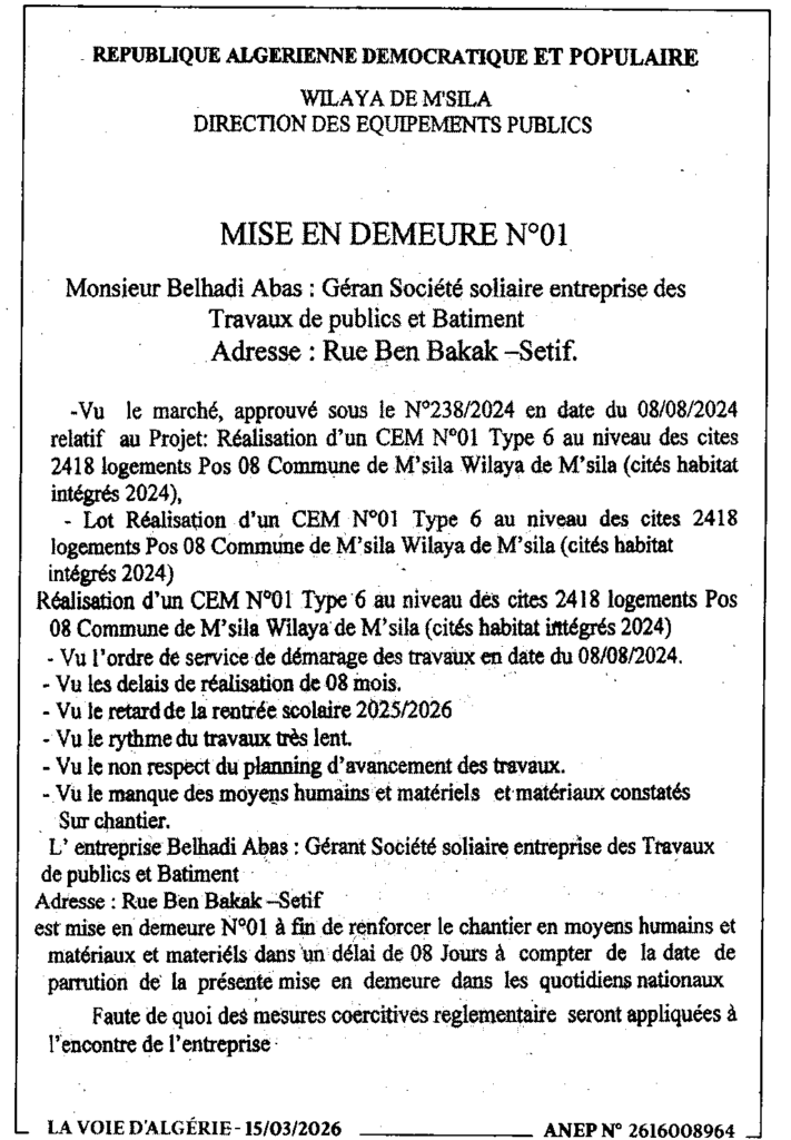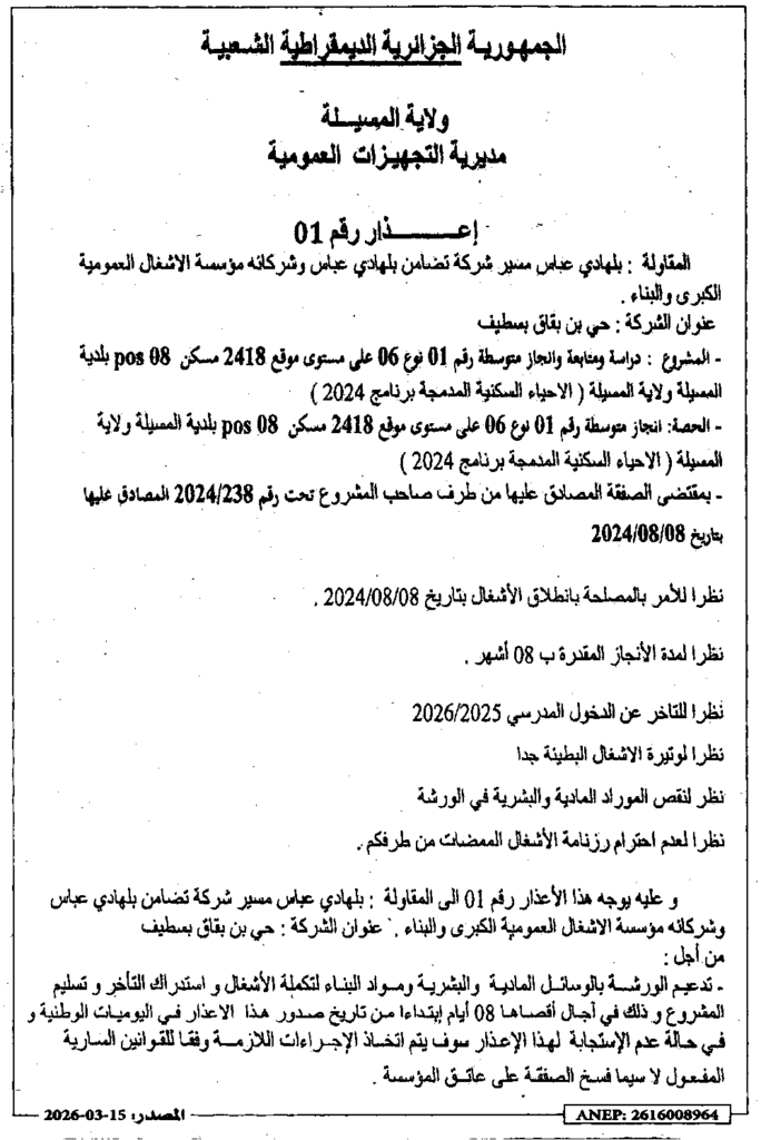 إعلان عن إعذار رقم 01 ادراسة ومتابعة وانجاز متوسطة رقم 01 نوع 06 بلدية المسيلة/ مديرية التجهيزات العمومية لولاية المسيلة