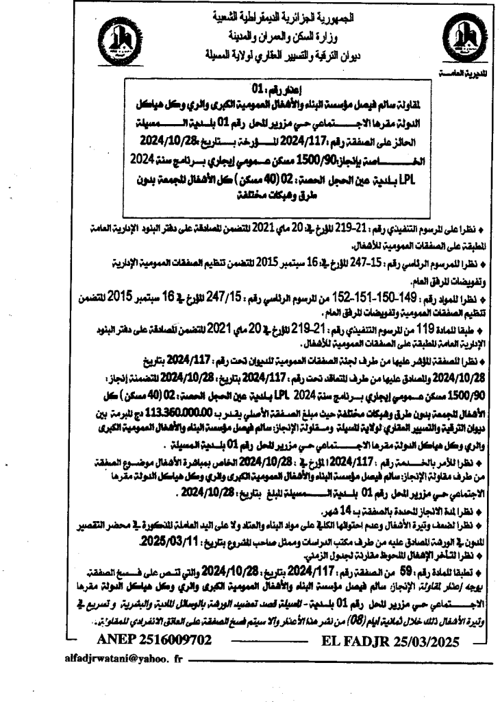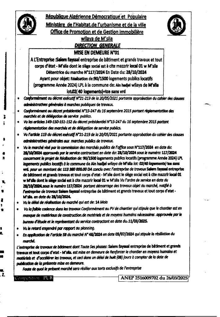 إعلان عن إعذار رقم 01 الخاصة بانجاز 1500/90 مسكن عمومي ايجاري بلدية عين الحجل/ ديوان الترقية والتسيير العقاري لولاية المسيلة