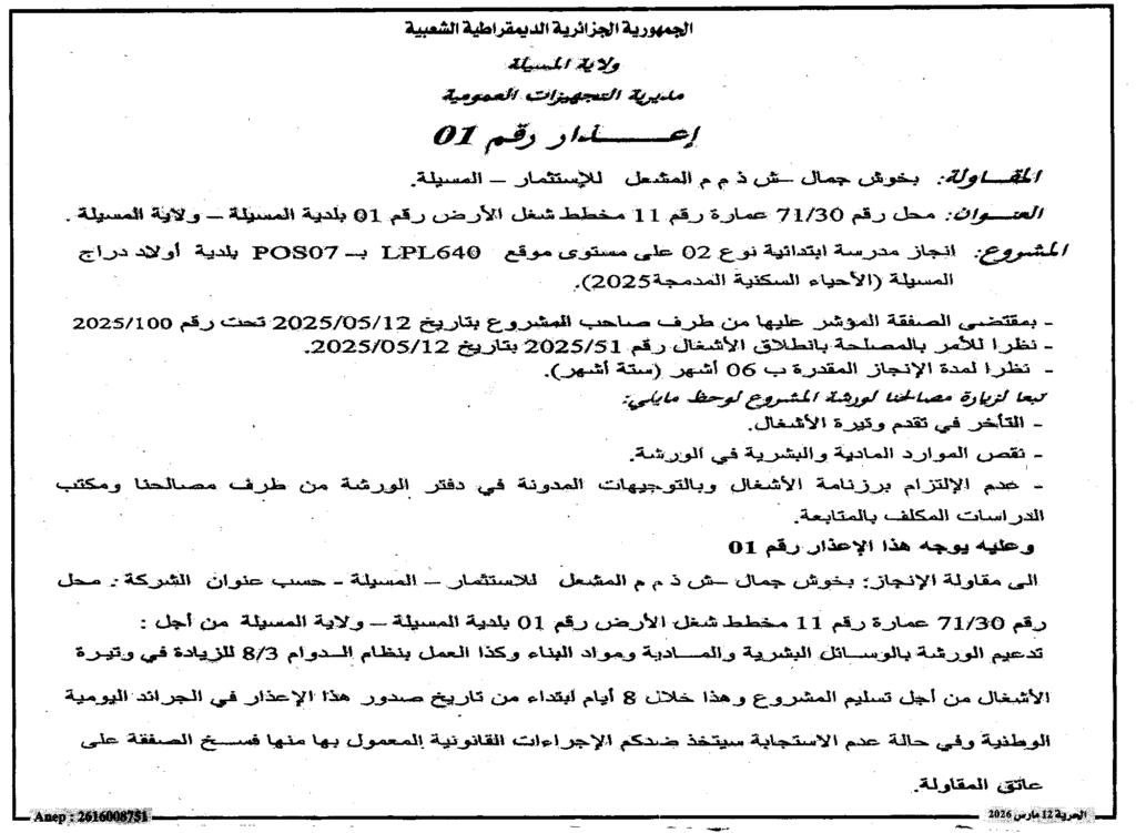 إعلان عن إعذار رقم 01 انجاز مدرسة ابتدائية نوع 02 بلدية أولاد دراج/ مديرية التجهيزات العمومية لولاية المسيلة
