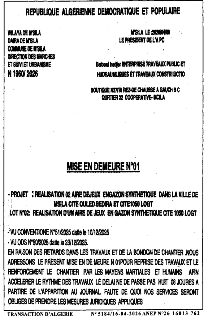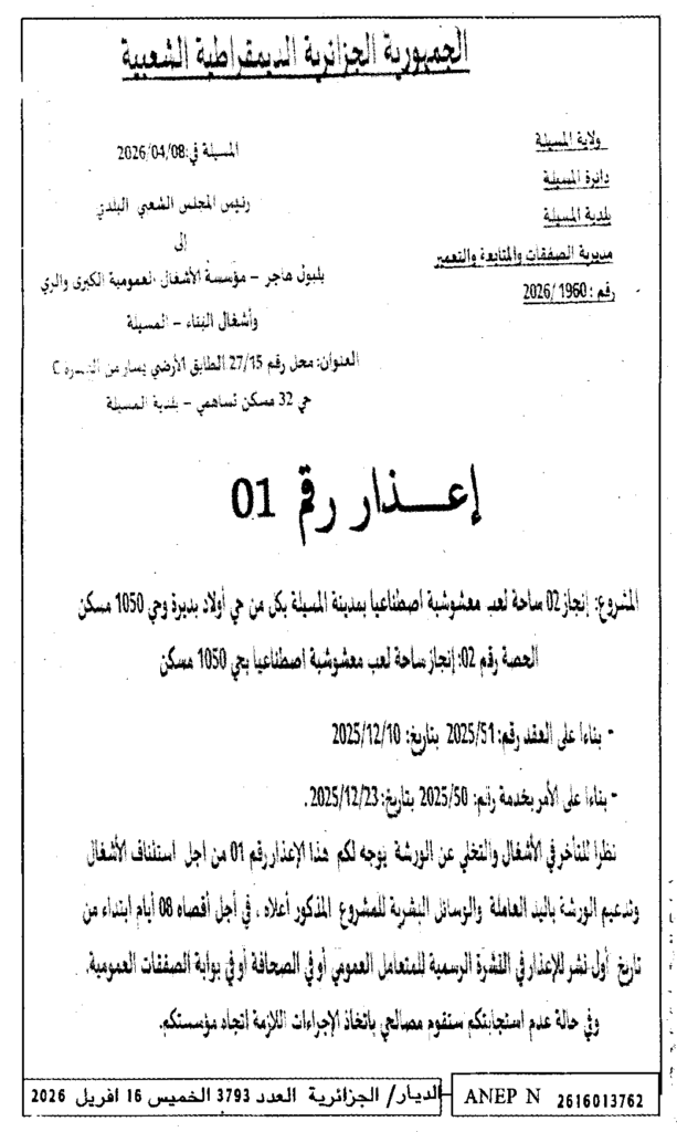 إعلان عن إعذار رقم 01 انجاز 02 ساحة لعب معشوشبة اصطناعيا بمدينة المسيلة/ بلدية المسيلة