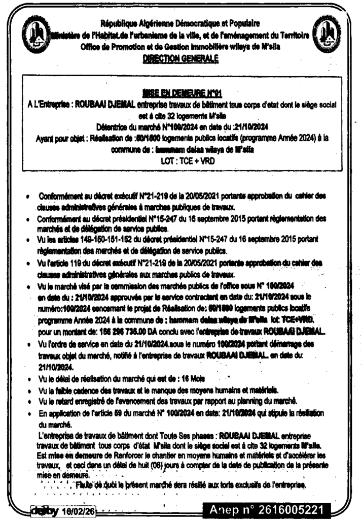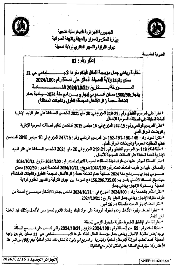 إعلان عن إعذار رقم 01 انجاز 1500/50 مسكن عمومي ايجاري/ ديوان الترقية والتسيير العقاري لولاية المسيلة