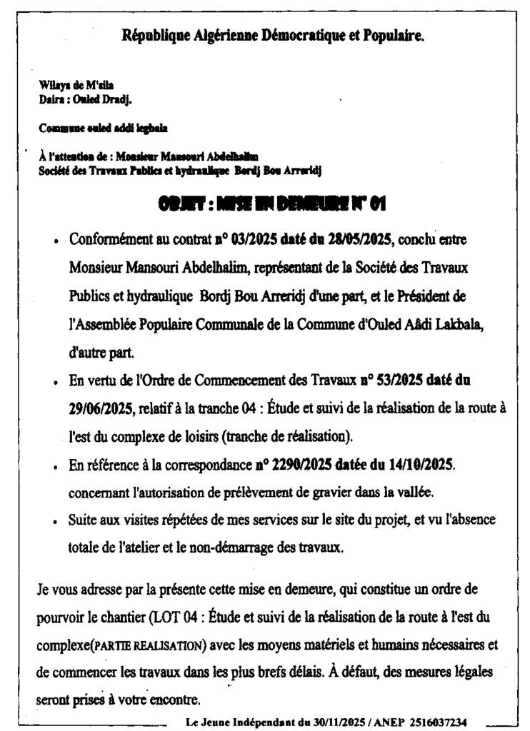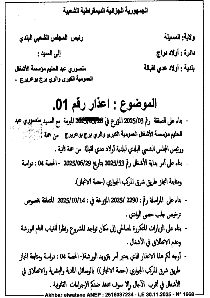 إعلان عن إعذار رقم 01 بلدية أولاد عدي لقبالة