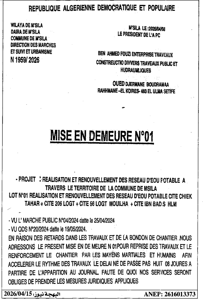إعلان عن إعذار رقم 01 بلدية المسيلة