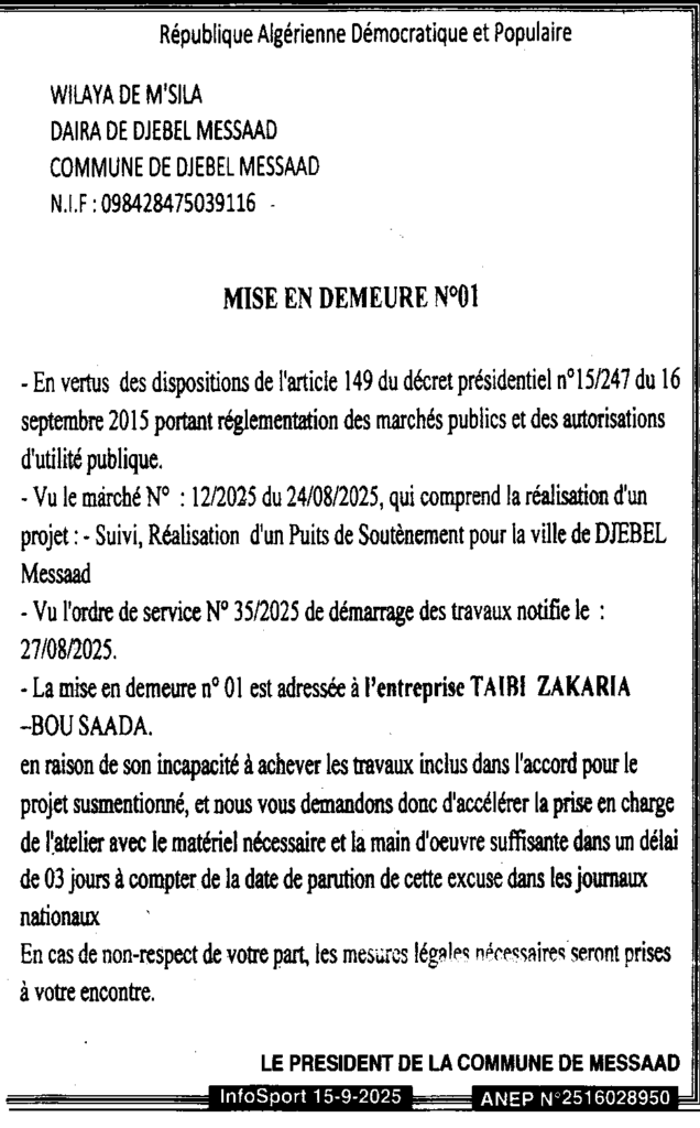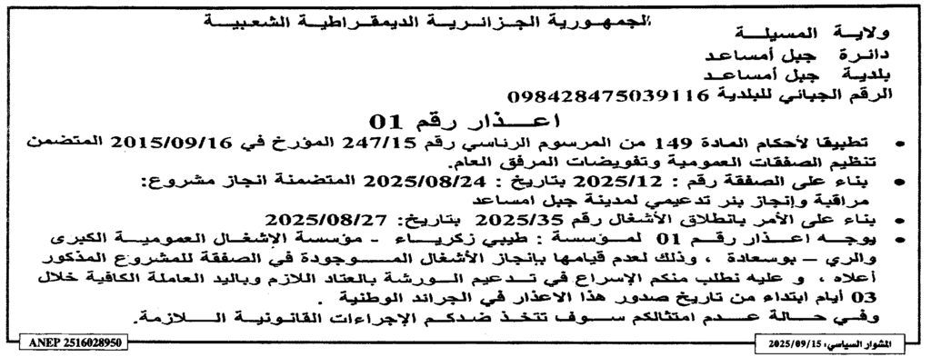 إعلان عن إعذار رقم 01 بلدية جبل امساعد