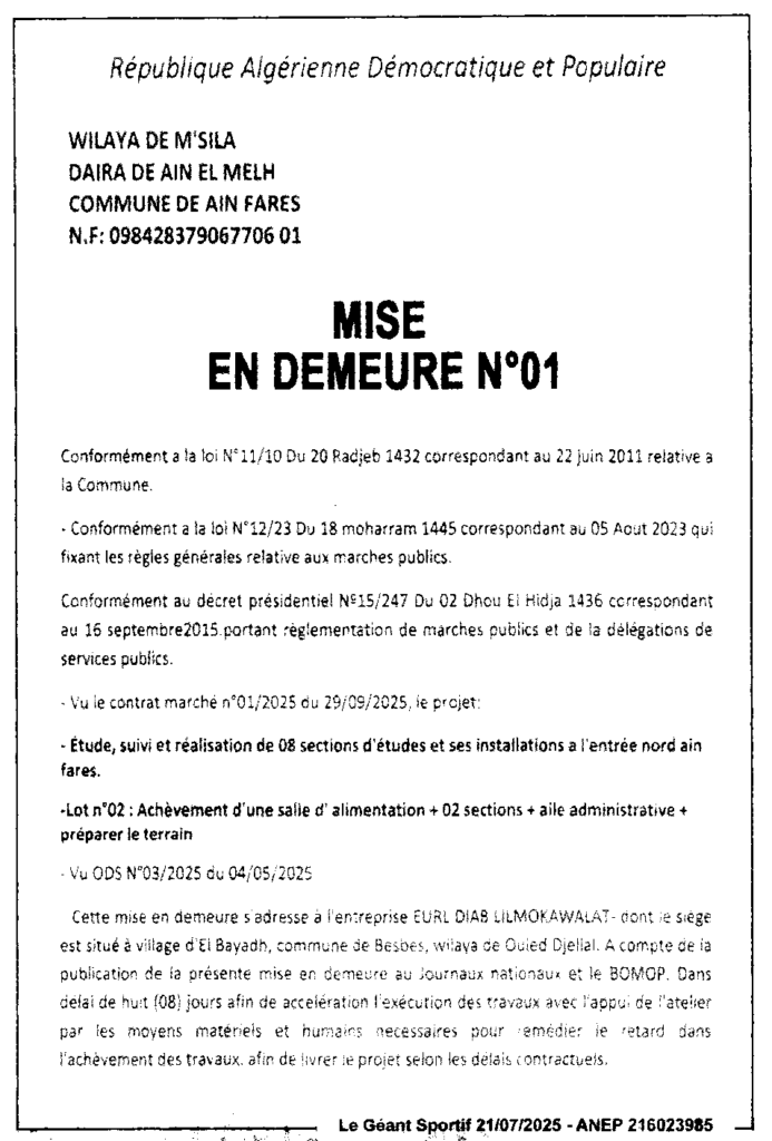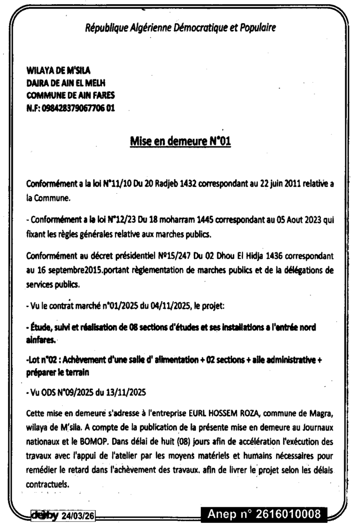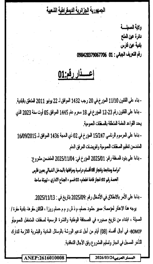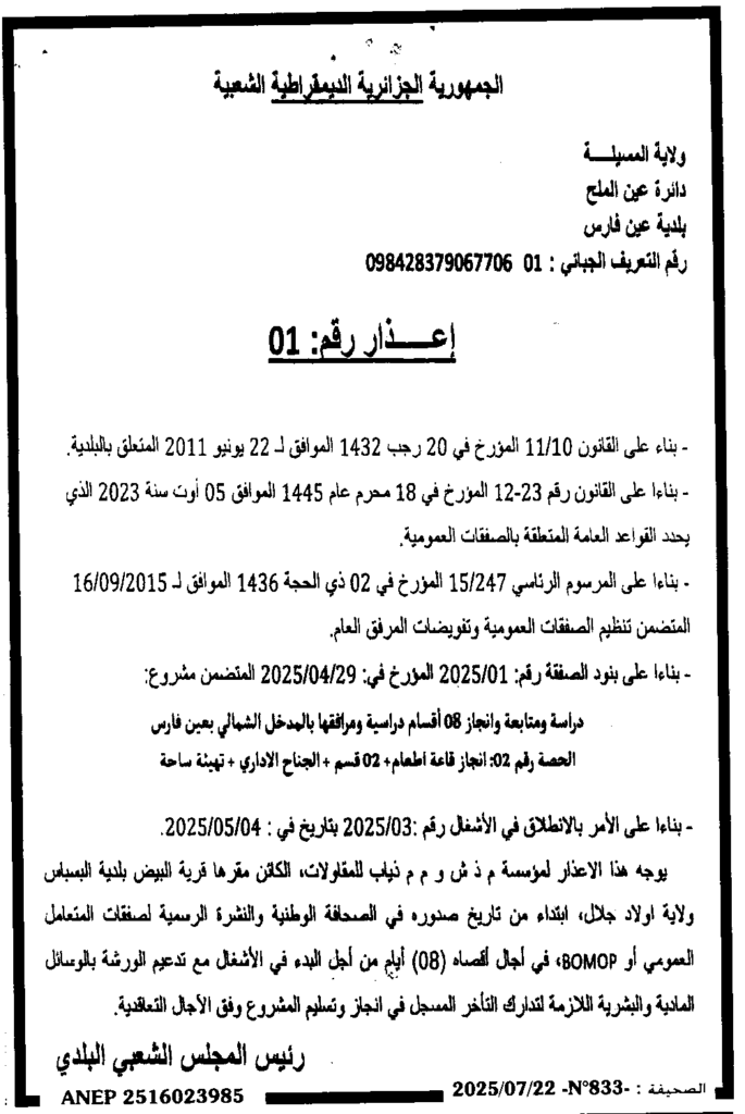 إعلان عن إعذار رقم 01 بلدية عين فارس