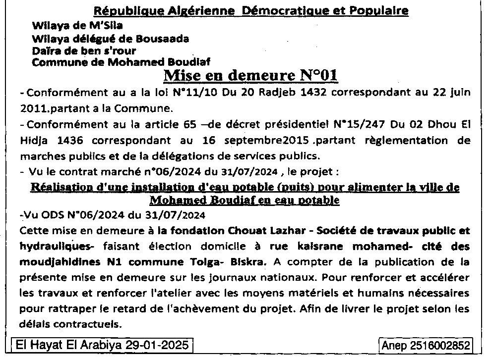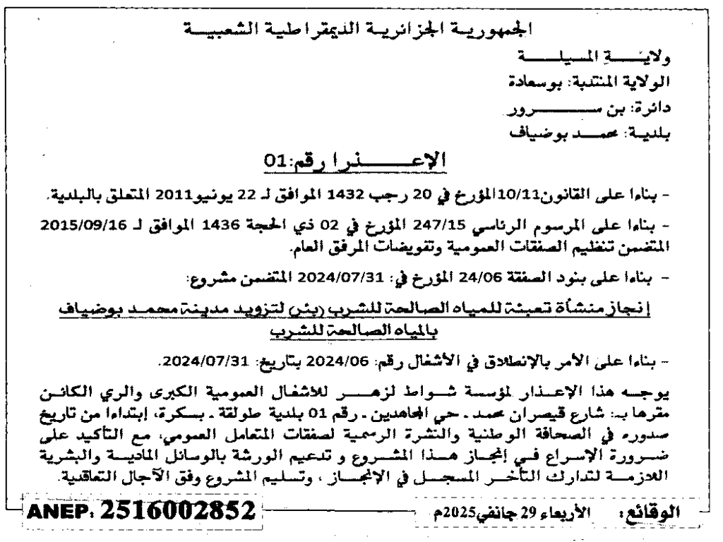 إعلان عن إعذار رقم 01/ بلدية محمد بوضياف