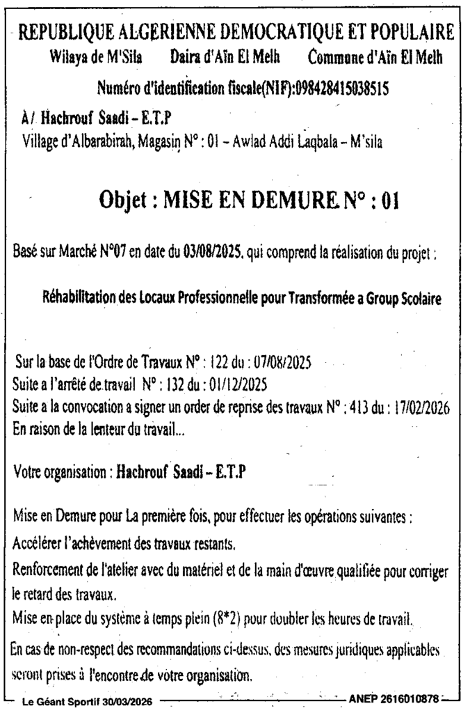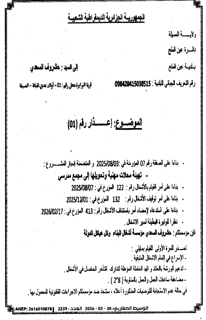 إعلان عن إعذار رقم 01 تهيئة محلات مهنية وتحويلها إلى مجمع مدرسي/ بلدية عين الملح