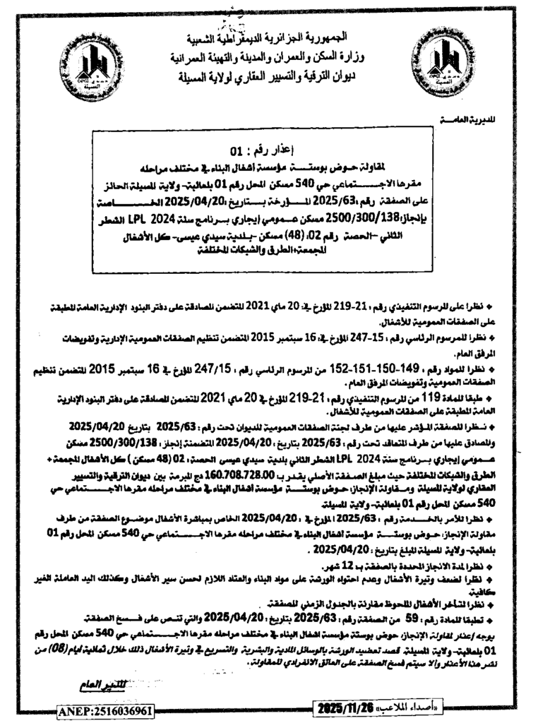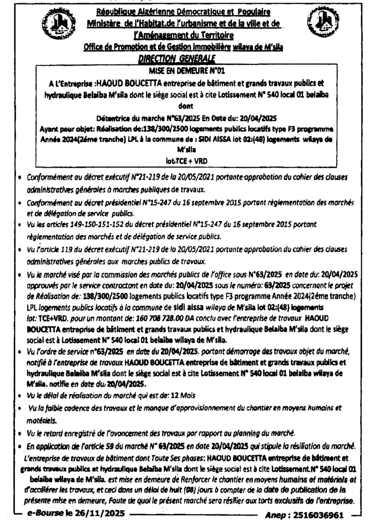 إعلان عن إعذار رقم 01 ديوان الترقية والتسيير العقاري لولاية المسيلة