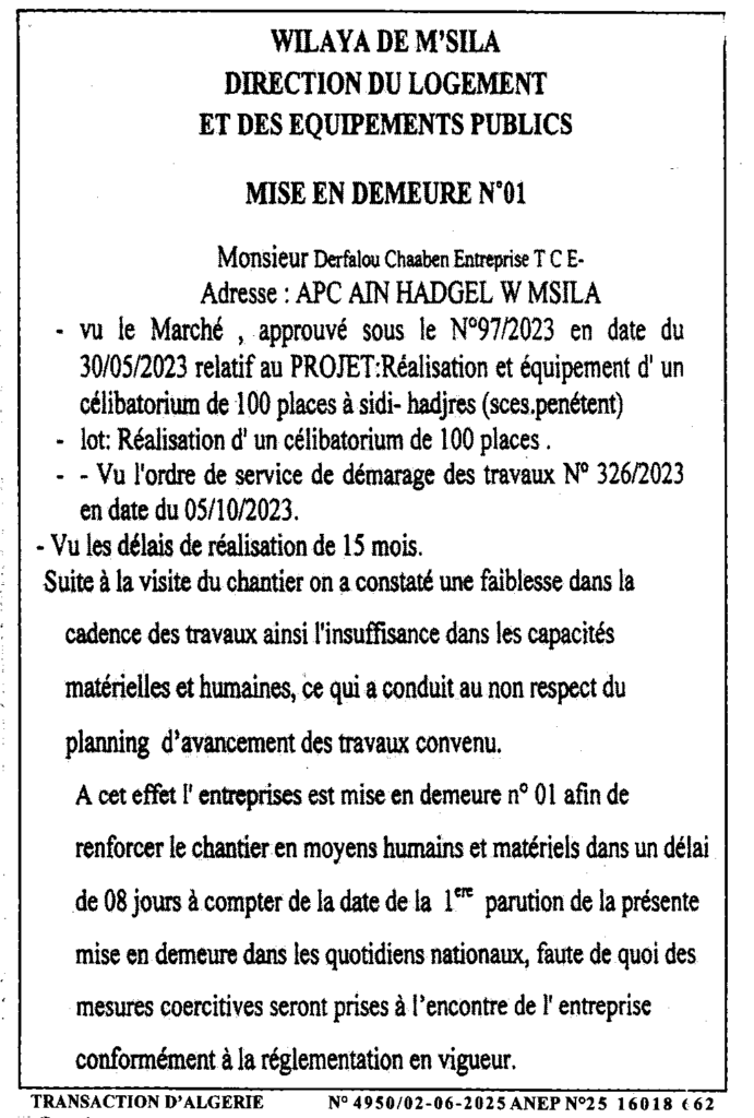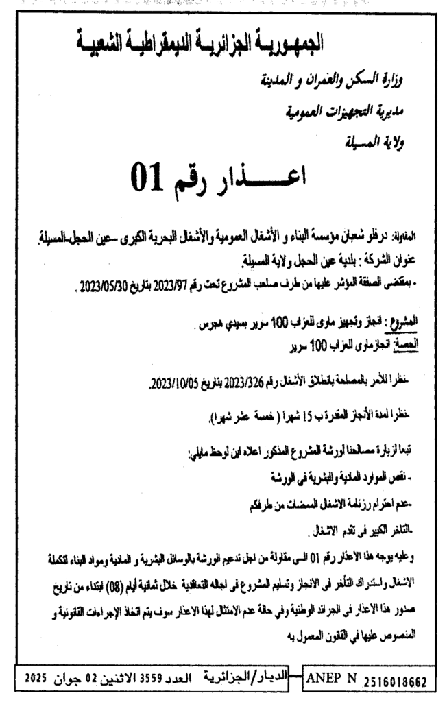 إعلان عن إعذار رقم 01 لمشروع انجاز وتجهيز مأوى للعزاب 100 سرير بسيدي هجرس/ مديرية التجهيزات العمومية لولاية المسيلة
