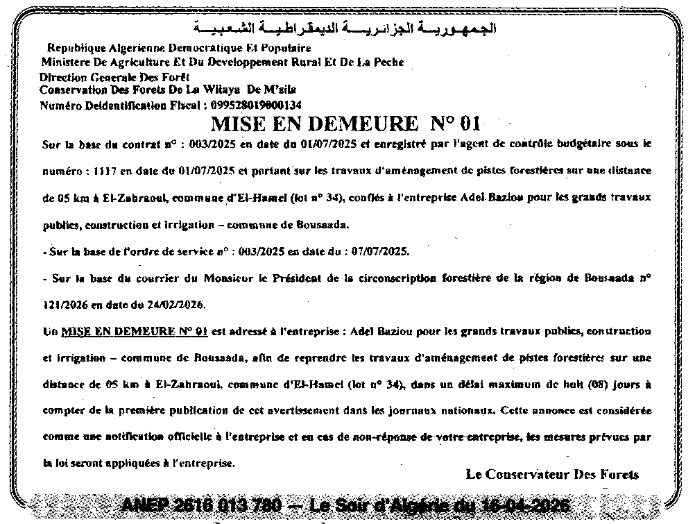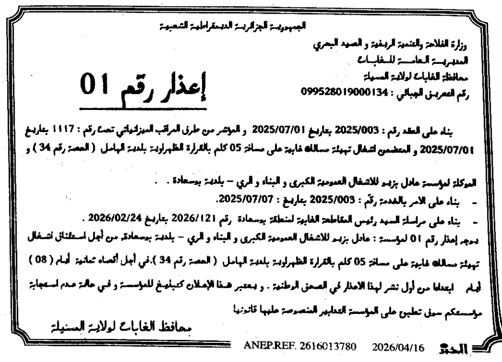 إعلان عن إعذار رقم 01 محافظة الغابات لولاية المسيلة