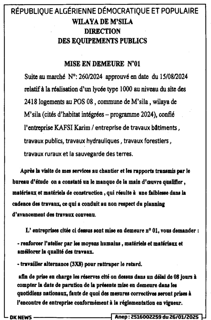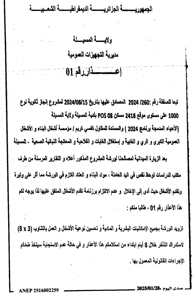 إعلان عن إعذار رقم 01/ مديرية التجهيزات العمومية لولاية المسيلة